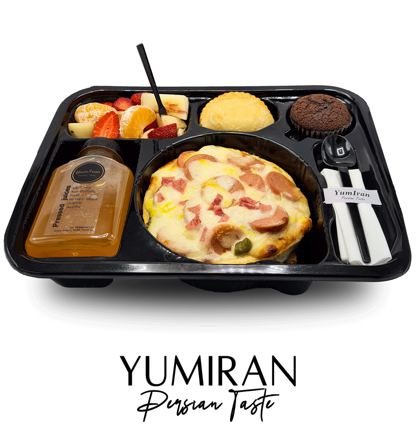 این بسته پذیرایی تک نفره شامل مینی پیتزا (به قطر 14 سانتیمتر)، آب میوه، سالاد میوه فصل، کیک، و پیراشکی سبزیجات می باشد.