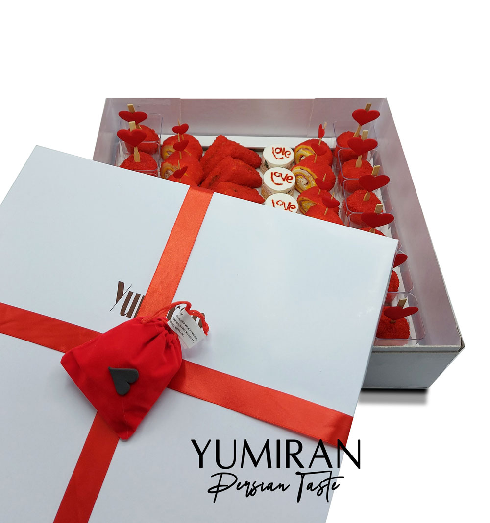 این سینی فینگرفود داخل جعبه قرار می گیرد و سپس دور جعبه روبان قرمز پیچیده می شود و در نهایت یک عدد بگ حاوی شکلات با طرح ولتناین روی جعبه قرار می گیرد.